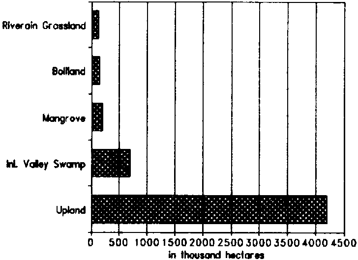 The breakdown of cultivable land into upland and lowland is given in Table 4 and Figure 2. It shows the relative importance of the four classes of lowlands, with a total area of about 1.2 million ha: inland valley swamps (IVS), bolilands which are drainage depressions, mangroves in the coastal tidal zone, and annually flooded riverine grasslands. It should be noted, however, that the 1.2 million ha correspond to the total area of lowlands. Lowland suitable for development is about 807 000 ha, ignoring environmental aspects.