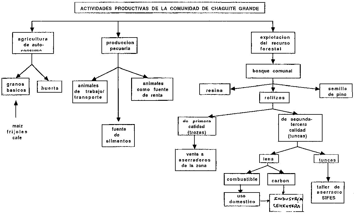 Durante todo este período, los miembros de Chaguite Grande, se han dedicado a la extracción de la resina, a la producción y comercialización de rollizos de "primera" calidad (trozas) y a la recolección de semillas de pino. El aprovechamiento del recurso forestal no estaba sujeto a una explotación que se pudiese considerar racional. De hecho, las condiciones socio-económicas imperantes en la comunidad habían impulsado a la sobreexplotación del recurso forestal.