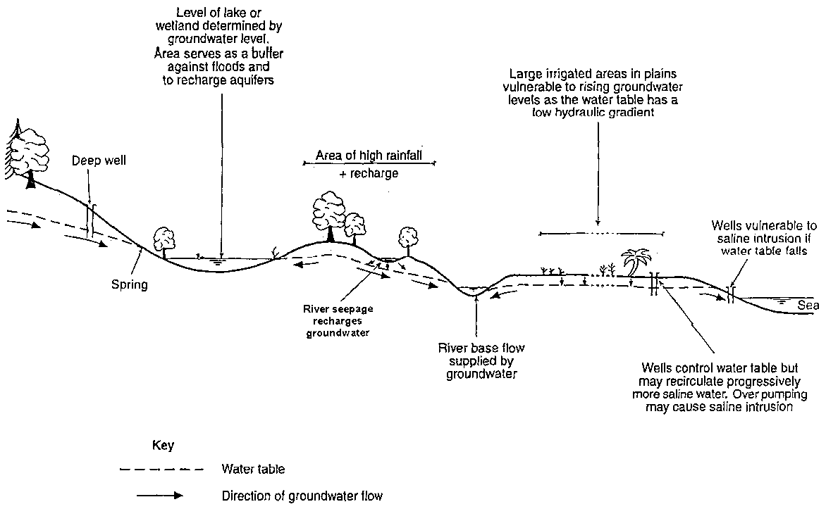 This section is concerned with the consequences of impacts resulting from a change in the flow regime of rivers, or a change in the movement of the water table, through the seasons. The consumptive nature of irrigation means that some change to the local hydrological regime will occur when new schemes are constructed and, to a lesser extent, when old schemes are rehabilitated. The ecology and uses of a river will have developed as a consequence of the existing regime and may not be able to adapt easily to major changes. It is also important to recognize the interrelationship between river flows and the water table. During high flow periods, recharge tends to occur through the river bed whereas groundwater often contributes to low flows. Figure 3 is a conceptual diagram of flow through a river-supplied irrigation scheme. Figure 4 illustrates the links between surface and groundwater.