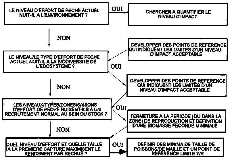 Les PRC et les PRL peuvent être intégrés à un ensemble de critères d'aménagement (Tableau 5). L'établissement de tels ensembles de règles sera très efficace s'il est basé sur une suite de questions et d'actions tel qu'indiqué à la Figure 14. Si un au moins de ces derniers critères est atteint, une action d'aménagement prédéfinie est déclenchée. Un tel ensemble de critères a semble-t-il été élaboré pour la pêcherie de poissons démersaux de la Mer de Bering et du Golfe d'Alaska, et comprend: une biomasse-seuil fixée à 20% de la biomasse du stock vierge; un taux de mortalité par pêche fixé à 30% de la Biomasse Féconde du Stock rapportée au recrutement (BFS/R); et un taux maximal de mortalité par pêche fixé à 80% de la valeur de M pour les espèces concernées.