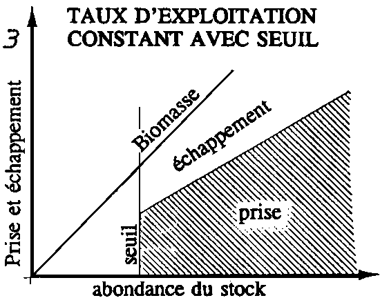 3) ici encore un scénario de contrôle de l'effort constant, limité par un seuil donné si les variations naturelles ont pour conséquence une très faible taille du stock;