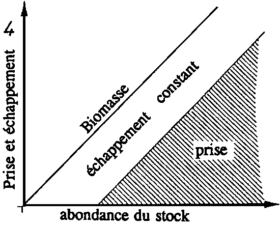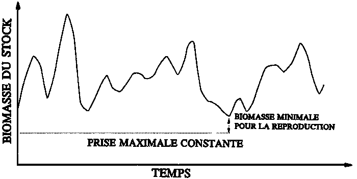 Certains chercheurs ont montré les avantages qu'il y avait à fixer le niveau d'effort plutôt que des quotas de capture (Hannesson, 1993) (Fig. 16). Beddington et May (1977) ont souligné qu'une stratégie de gestion à capture constante verrait les perturbations environnementales causer des écarts par rapport aux conditions d'équilibre plus graves que dans le cas d'une stratégie d'effort de pêche constant. Ceci est également la conclusion de Reeves (1974) qui a montré par des simulations qu'en cas de variation du recrutement, limiter l'effort permet des taux de capture plus importants que fixer un quota, même si ce dernier correspond au même Point de Référence exprimé en termes d'effort de pêche.