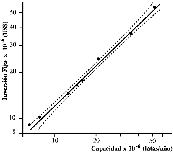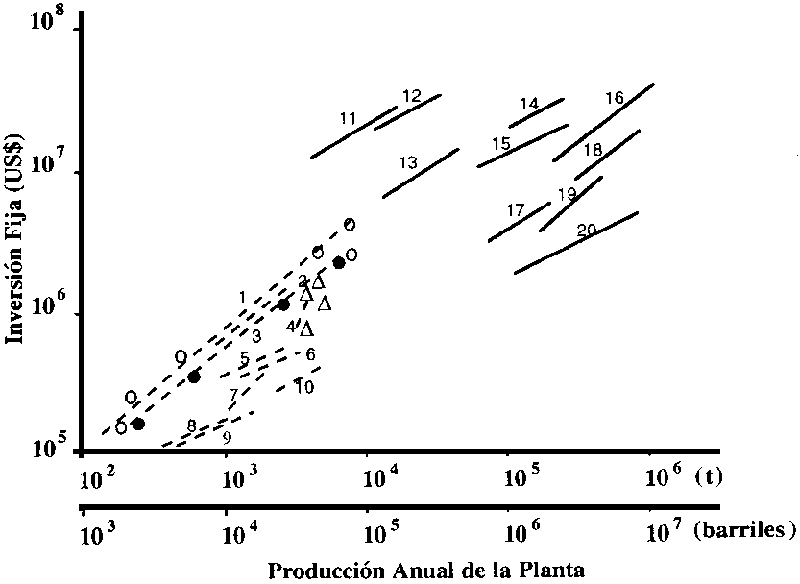 d) Debe observarse que el intervalo válido de capacidades para la aplicación del factor costo-capacidad es de 8-35 t/día. Sin embargo, esta estimación puede ser usada para obtener un orden de magnitud de la inversión requerida.