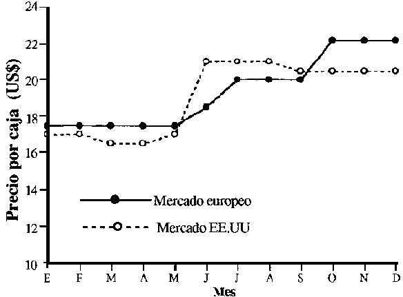 Un ejemplo de esta variación en el precio de venta se muestra en la Figura 4.1. En este caso, los precios de venta de conservas de atún en salmuera (48 latas × 182 g) importado por EE.UU y Europa de Tailandia durante 1993, muestran variaciones superiores al 25,75% y 28,58%, respectivamente.