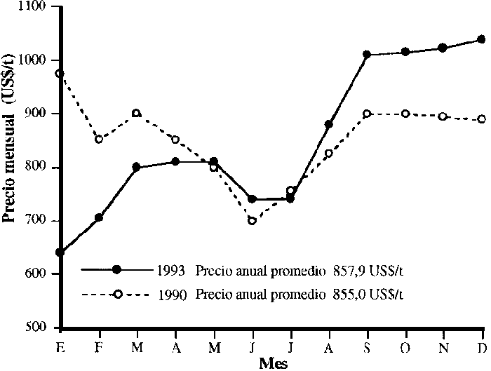 Figura 4.1 Precio mensual de conservas de atún en salmuera (48 latas × 182 g cada una) importado por EE.UU y Europa de Tailandia durante 1993 (del Banco de datos de FAO GLOBEFISH)