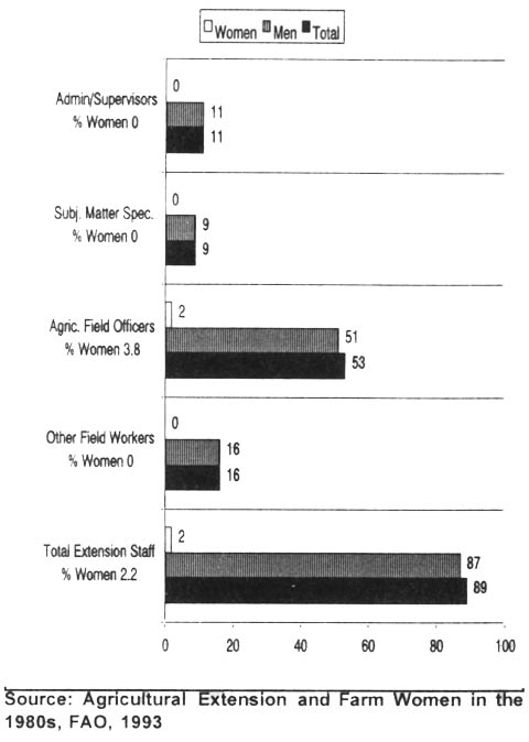 In 1988, there was a total of only 97 agricultural extension staff, including 3 women, or about 3% of the total.