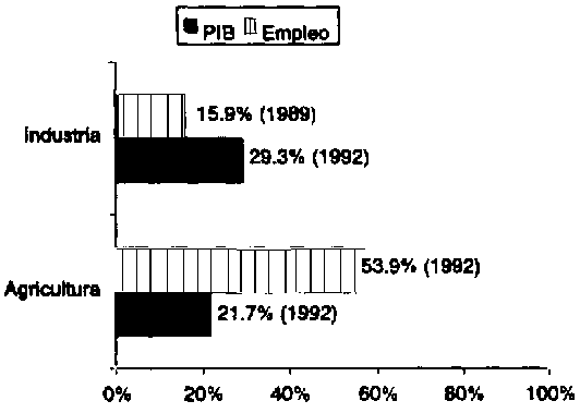 Contribuciones sectoriales al PIB y al empleo, 1992
