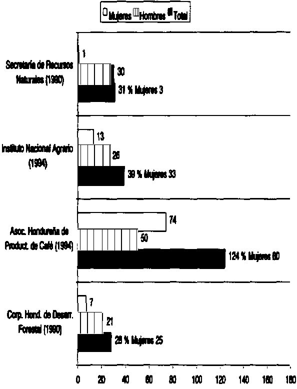 Miembros y funcionarias de las organizaciones agrícolas/rurales. Las organizaciones rurales son importantes en cuanto al acceso a los recursos institucionales. Las mujeres rurales se organizan en varios tipos de grupos, sobre todo en los integrados sólo por mujeres, incluidos los circulos tradicionales de amas de casa. En 1993, habla 14 federaciones o asociaciones de mujeres campesinas, algunas independientes y otras que funcionan como secciones femeninas de las organizaciones campesinas en general. En las organizaciones rurales mixtas, las mujeres representan un porcentaje cada vez mayor, aunque todavía reducido, de los puestos directivos. La sección nacional de una de las dos principales confederaciones está dirigida por una mujer. Hay pocos hombres o mujeres que sean miembros de los sindicatos en las zonas rurales y las mujeres no participan significativamente, en ellas, aunque constituyen la mayor parte de los trabajadores agrícolas y agroindustriales. El movimiento cooperativo tiene una tradición de 30 años y en 1990 las mujeres representaban el 61,4% de los miembros de dichas cooperativas. De estas' el 88,1% se ocupaba del ahorro y del crédito, el 15% de la agricultura, y el 1,6% del sector forestal. Las mujeres representaban solamente un 1,9% de los miembros de las cooperativas agrícolas y un 0,2% de los de las cooperativas forestales. En 1993, el 15% de las mujeres ocupaban cargos directivos, frente al, 3% de 1988. En 1993 se creó un Comité Nacional de la Mujer Cooperativista para promover la participación femenina en las actividades económicas y la igualdad con los hombres en el movimiento. Entre 1990 y 1993, la Secretarla de Recursos Naturales se ocupaba de más de 5 000 grupos, de los cuales aproximadamente el 25% eran de mujeres.