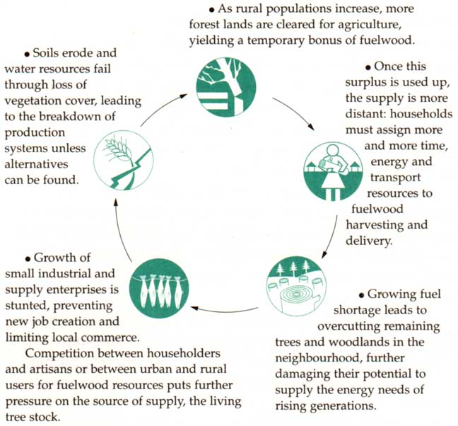 In particular, it pointed out that intensive household use of fuelwood as a 'common property resource' goes largely unregulated and poses a high risk both to trees and to the people who depend on them for their livelihood, accelerating a cycle of forest depletion, stagnating local economies and worsening poverty (see Figure 1).