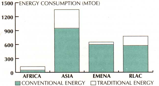 South Saharan countries consumed the least energy (120Mtoe), whereas Asian countries consumed the most (1350Mtoe). Latin America and the Caribbean consumed 700Mtoe and Emena 650Mtoe. Traditional fuels provided the energy needs of different regions in the following percentages: Africa, 60 per cent; Asia, 40 per cent; Latin America and the Caribbean, 30 per cent; Emena, 10 per cent. It is important to note that in many individual countries, the proportion taken by traditional energy is even higher than these percentages.