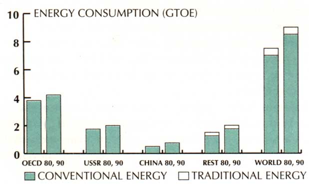 In the early eighties, during the second energy crisis, the total energy consumption of developing countries (including China) was 1740Mtoe: about 70 per cent of the world's population was responsible for about 24 per cent of world energy consumption. By the end of the decade energy consumption in developing countries grew to 29 per cent, but consumption per capita remains very low compared to that of people in developed countries.