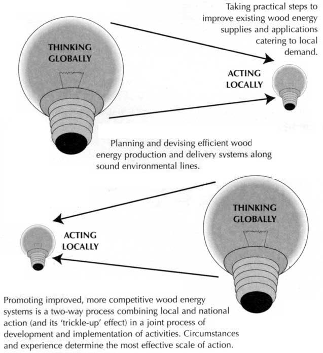 Over time (though less obviously) they can also be expected to affect global market trends and environmental security. Judging by evidence from various studies, including the RWEDP study (see left) in Cebu City, it makes sense to 'think globally - act focally' by putting into action decentralised area based plans for fuelwood and charcoal production, trade and use wherever local circumstances of supply and demand merit it.