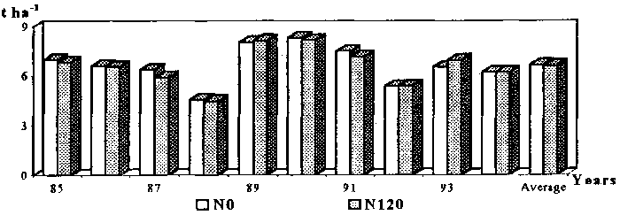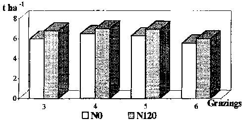 The optimum regime was 4-5 grazings without N application (Figure 1). The annual yield responses to N application ranged from 3.8 to 5.4 kg DM per kg of applied N, which were economically inefficient. These values are within the range cited by Frame and Newbould (1986). The grass/white clover sward gave stable DM yields of 6.2-6.4 t ha-1 which was equivalent to the productivity of grass swards receiving 240 N ha-1 annually.