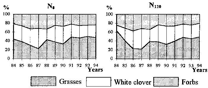 Termination of N application in the second stage of experiments did not produce any significant effect on the sward productivity. However it had a positive effect on the spread of white clover in the sward (Figure 3). In the 15th year of the pasture utilization a sward with a favourable botanical composition was formed which consisted of: 44.8-56.5% grasses; 21.1-31.5% white clover; 17.5-26.2% forbs on a DM basis (Figure 3).