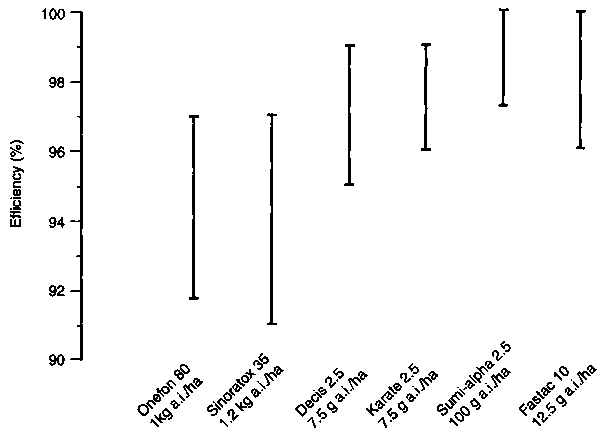 The type of chemical used is very important. The range of useful chemicals is now widening, although only a few are used on a large scale. Useful chemicals include fenitrothion, trichlorfon, fenthion, methyl-parathion, malathion and diazinon. The quantity of pesticide active ingredient per hectare could be substantially reduced by the addition of small quantities of oil; experiments on fenitrothion in Bulgaria are encouraging on this topic. The effect of the chemical on other cereal pests must also be considered.