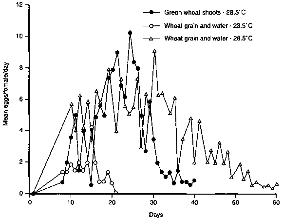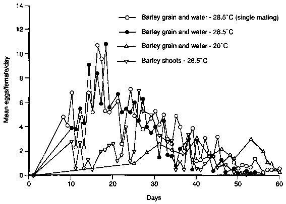 Factors favouring mass multiplication of heteropteran stink bugs have been studied in detail in species from different climatic regions in Canada, the United Kingdom and Iran. High temperature was important to Aelia and Eurygaster spp. in subtropical regions, but adversely affected temperate species. Food resources affected fecundity in all the pentatomid species that live on cereals and legumes. Fecundity and longevity of sunn pest species were much higher on grains. In Aelia and Eurygaster, fecundity and longevity were greater on wheat and barley grain with water than on green shoots of these cereals (Figures 7 and 8). Fecundity of these pests was slightly higher on grain and green shoots of wheat than on barley. The mean female fecundity of E. integriceps on wheat grain and water was about 190 to 200 eggs, and on barley grain and water about 180 to 185 eggs at 28°C and 70 percent relative humidity (Figures 7 and 8). Fecundity, however, decreased by half when insects were kept on green shoots of wheat or barley at the same temperature or at low temperatures of 20 to 23°C. E. integriceps fecundity sharply decreased when it was bred under crowded conditions on both wheat and barley grain with water. This is shown in Table 13.