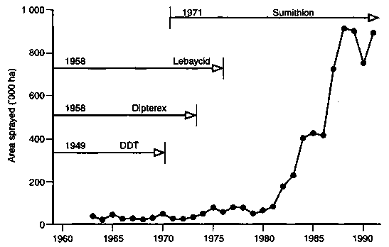 From 1968 to 1978, approximately 100 000 litres of Sumithion 50 ec were used per year. Use of this insecticide against sunn pest has increased since 1978 to nearly 1.5 million litres in 1987 to 1992 (Figure 9).