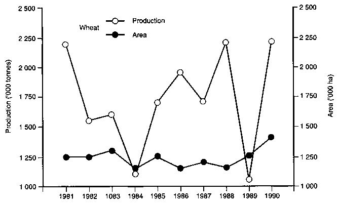 Currently, there are few active government policies regarding the production of wheat. It has been government policy to distribute improved wheat seed and to provide inorganic fertilizer to wheat growers. Tractors and other farm machinery were also hired or loaned to large-scale producers. These programmes have been less active since the onset of the war and the once-large irrigation systems have been mostly destroyed or have fallen into disrepair.