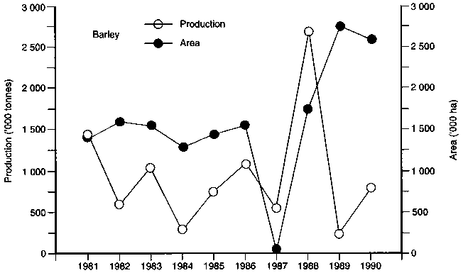 Survey reports from SCA (1989) showed that 0.5 million ha of cropland had been infested by a combination of locusts and sunn pests. This figure must be considered a minimum since the surveyors were able to visit only a small part of each province.