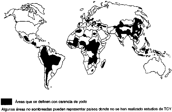 Muchos países de Asia, África y América Latina tienen importantes problemas de carencia de yodo, aunque algunos han hecho grandes progresos en reducir la prevalencia de los TCY. India y China, con sus grandes poblaciones, todavía tienen alta prevalencia de los TCY. No se han estudiado todos los países africanos, pero se conoce que los TCY predominan en Etiopía, Nigeria, Tanzania, Zaire, Zimbabwe y en otras naciones más pequeñas. En el continente americano, el bocio endémico se ha controlado en gran parte de los Estados Unidos y Canadá, pero muchos países andinos, incluyendo Bolivia, Colombia, Ecuador y Perú todavía tienen altos niveles relativos tanto al bocio endémico como a tasas de cretinismo. Los TCY también se encuentran en países de América Central y en ciertas partes de Brasil.