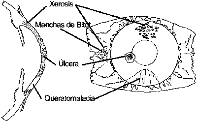 La carencia alimentaria de vitamina A afecta frecuentemente y de manera importante a los ojos y puede llevar a la ceguera. La xeroftalmía, que significa sequedad de los ojos (de la palabra griega xeros que significa seco), es el término que se utiliza para incluir las manifestaciones oculares resultantes de la falta de vitamina A. La carencia de vitamina A tiene además un papel en varios cuadros clínicos no relacionados con los ojos, y puede contribuir a aumentar la tasa de mortalidad infantil, sobre todo en niños con sarampión. Se ha demostrado que animales de laboratorio con dietas carentes de vitamina A pueden influir en la presencia de infecciones agudas. Aparte del ojo, la carencia de vitamina A también afecta adversamente las superficies epiteliales, y se asocia con un aumento en la incidencia de ciertos tipos de cáncer, incluso el cáncer de colon. Las manifestaciones oftálmicas graves de la carencia de vitamina A producen destrucción de la córnea y ceguera, y se observan principalmente en niños de corta edad (Foto 27). Esta enfermedad algunas veces se denomina queratomalacia.