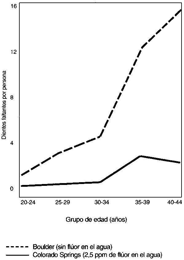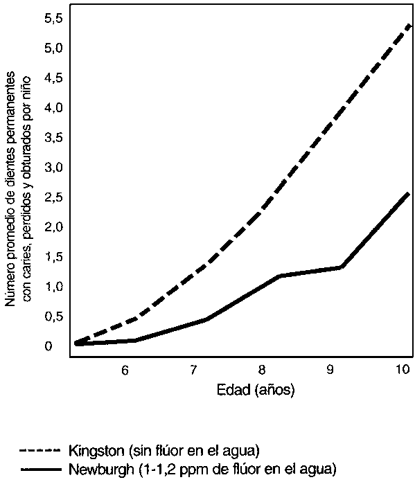 La Figura 12 compara el índice CPO en dos ciudades del estado de Nueva York, en los Estados Unidos: Kingston, donde no había flúor en el agua municipal y Newburgh que tenía cantidades óptimas de flúor. Se puede observar que a la edad de 10 años, los niños que no recibían flúor en el agua potable tenían un CPO de 5,5 en sus dientes en comparación con 2,5 en los que recibían flúor. Otros estudios han demostrado una reducción inclusive mayor como resultado de la fluoración (Figura 13).