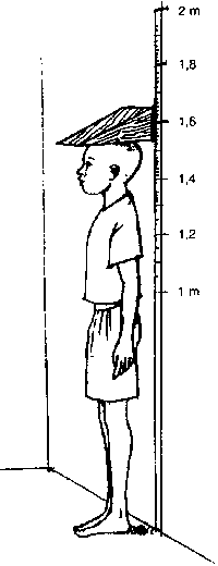 Localizar una pared vertical que se eleve de un suelo verdaderamente horizontal. Marcar con un lápiz una línea horizontal de aproximadamente 2 cm de largo a una altura de 1 metro desde el piso (60 cm para los niños). Luego, con cinta engomada, masilla o un chinche, asegurar la parte inferior de una cinta métrica de 1 metro de largo, para que corresponda con la línea marcada en la pared. Fijar la parte superior de la cinta métrica que ahora debe estar a dos metros de distancia del suelo. La persona que se va a medir se debe parar contra la pared mirando hacia el frente (Figura 17). La estatura de la persona se determina con un bloque de madera en ángulo recto sobre la pared. Es adecuado utilizar un bloque rectangular con dimensiones de 30 × 10 × 20 cm, aunque un bloque triangular de las mismas dimensiones, según se muestra en la Figura 17, es más fácil de manejar.