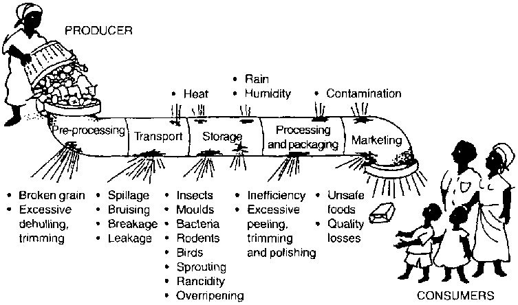 The development of labour-intensive food processing industries in rural areas is another option that can help stabilize food supplies, provide employment opportunities and raise incomes, in addition to reducing the massive post-harvest losses that occur in perishable commodities in many African countries. Figure 11 illustrates the source and nature of some of these food losses occurring between producer and consumer. Improvements in post-harvest management at the village and household levels can often significantly reduce food losses and increase overall food availability. An additional gain is that a reduction of losses leads to lower costs for producers and distributors, as well as lower prices for consumers. Food storage and processing and the effects of improvements in this sector on household food security are discussed in more detail in Chapter 6.