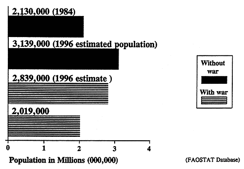 | Approximately 300,000 people are estimated to have died as a result of conflict due to violence and hunger. An additional 800,000 people are living as refugees outside Liberia. The dark bars show the expected population in 1996 in Liberia based on the 1984 census and an expected 3.3 percent annual growth rate if there had been no conflict. The stripped bars show the estimated population of Liberia both inside and outside the country once the victims of war have been subtracted. As can be seen, the population of Liberia shows a decline once all refugees outside the country are taken into consideration. |