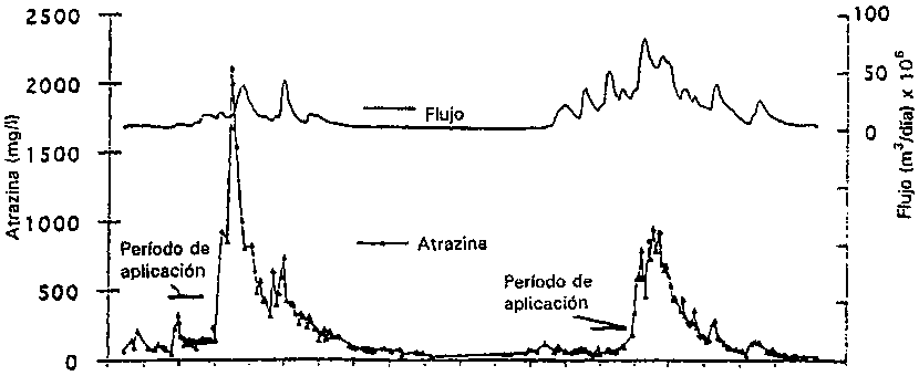 En lo que respecta a los plaguicidas que son muy solubles en agua, la supervisión debe estar estrechamente vinculada a los períodos de utilización de los plaguicidas. En los Estados Unidos, donde se han realizado importantes estudios sobre el comportamiento de la escorrentía de plaguicidas, las triazinas (atrazina y cianazina) y el alacloro (acetamina clorada) figuran entre los herbicidas más utilizados. Éstos se aplican fundamentalmente en primavera (mayo). Según estudios de Schottler et al. (1994), entre el 55 y el 80 por ciento de la escorrentía de plaguicidas tiene lugar en el mes de junio (Figura 13). La importancia de la supervisión de estos fenómenos es que muchos de los nuevos plaguicidas solubles sólo se pueden detectar inmediatamente después de la aplicación. Por ello, los programas de supervisión que se aplican con periodicidad mensual o trimestral (práctica habitual en muchos países) probablemente no consigan cuantificar la presencia ni determinar la importancia de los plaguicidas en las aguas superficiales. Los plaguicidas que tienen aplicación limitada son todavía más difíciles de detectar en las aguas superficiales. Existe el peligro de que las autoridades lleguen a convencerse de que los valores ND (no detectables) sean demostración de la ausencia de plaguicidas. Es muy posible que ello signifique únicamente que los programas de supervisión no consiguieron recopilar datos en el momento oportuno o que no analizaron el medio más indicado.