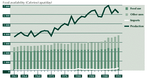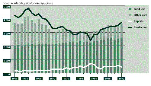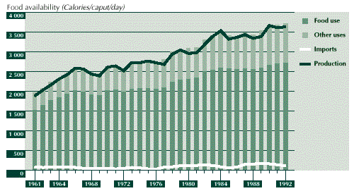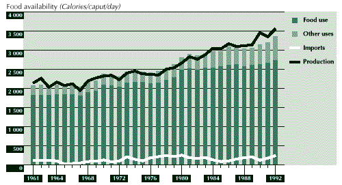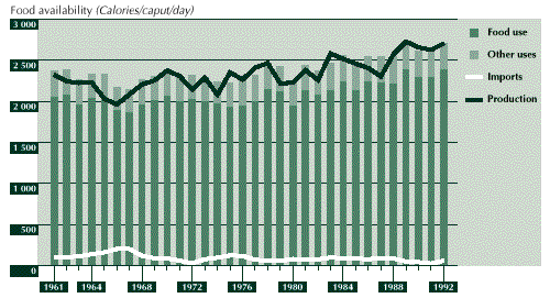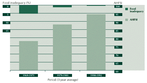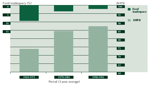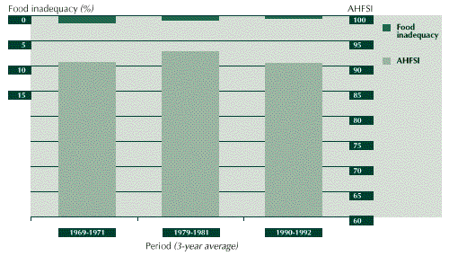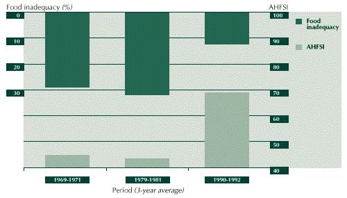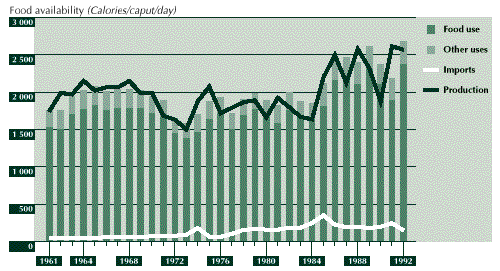 3.28 The net result of these developments was an average annual increase in per caput food availability of close to 1 percent, from around 2 200 Calories in 1961 to around 2 900 Calories in 1992. Although there are important regional differences in food intake in the country, improvements in AHFSI and food adequacy have closely followed those of average availability at the national level. The status of household food security increased from medium to high level, while the food gap declined from slightly less than 6 percent of average nutritional requirements to about 2 percent over the same period (see Figure 6).