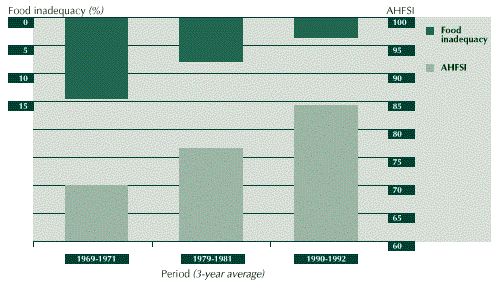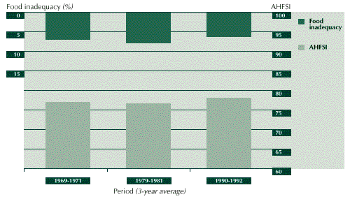 2.8 FAO has developed an aggregate household food security index (AHFSI) based on the work of Sen (1976) and Bigman (1993), which attempts to incorporate directly all of the three elements of food security mentioned earlier, namely, availability and stability of food supplies and access to food (see Box 1 for technical details). It has also introduced an intuitively more appealing indicator that measures the extent of inadequacy in food availability at the country level (see Box 2 for a more detailed definition), utilizing FAO estimates of the prevalence of the chronically undernourished. These two measures, combined with those of food availability obtained from food balance sheets, provide the background that threads together the policy experiences of the individual countries in so far as they have influenced the economic and social determinants of food security.