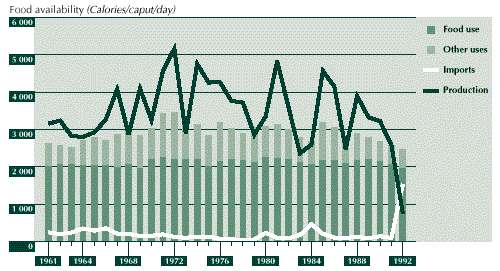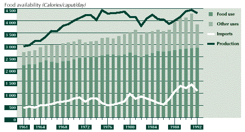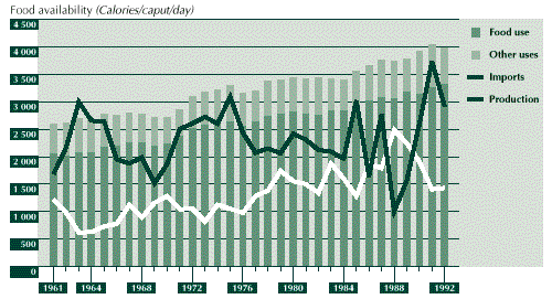 3.25 Food security in Costa Rica, in terms of both per caput food availability and production and direct indicators of household food security status, has steadily improved through the period studied. Part of the reason for this is the strong policy emphasis on poverty alleviation. Although macroeconomic problems were encountered and policy adjustments were made that reduced the production of some traditional crops, the shift in emphasis to export-drive growth allowed increases in food imports to maintain per caput food availability, which is currently just below 3 000 Calories per day.