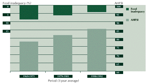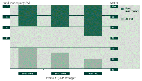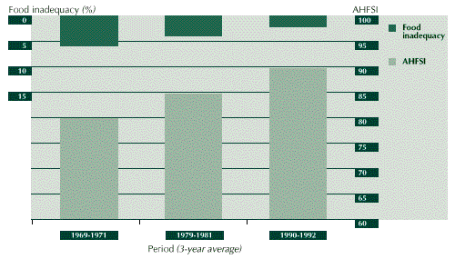 3.7 Burkina Faso has a history of fairly low household food security. The AHFSI and the food inadequacy index (see Figure 2) indicate that, up until the beginning of the 1990s, Burkina Faso had severe food insecurity problems, with an energy deficit of nearly one-third of the national requirements. The situation since then has improved significantly and the country is no longer considered to have a critically low level of household food security, i.e. the value of AHFSI is nearly 70, with the food inadequacy level reduced to about one-tenth of the national requirements.3