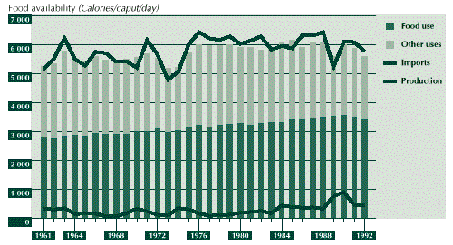 3.34 The worsening of macroeconomic imbalances in early 1980 led to the need to implement stabilization and structural adjustment measures. From 1984 onwards, the government gave up attempts to regulate the economy. International trade, financial markets and foreign investments were liberalized; a floating exchange rate system was introduced; domestic markets and labour relations were deregulated; and agricultural policy shifted focus from direct intervention in markets to market assistance to foster greater private-sector participation. Although the government retained control in some agricultural markets, such as rice, soybean and sorghum, the negative trend in per caput food production was reversed, from -2.8 percent per annum before 1983, as noted above, to +4.1 percent per annum thereafter. In parallel, the share of food imports in total food availabilities for direct human consumption (in energy equivalents), which had grown from 8 percent in the 1960s to nearly 20 percent by the early 1980s, has since stabilized around that level (see Figure 7).