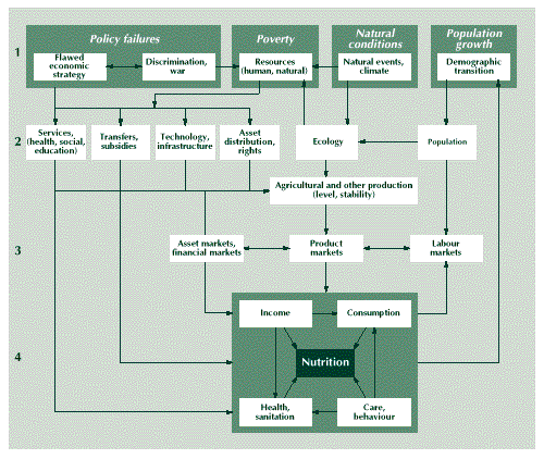 3.2 In the Figure, the top row represents basic causal factors: economic strategies and policy interacting with social discrimination and conflict; resource endowments and their relationship to climate and disasters influencing levels of poverty and food availability; and population growth. These factors directly affect the success of any policy and programme interventions (such as subsidies and asset distribution). The Figure is intended to highlight the primary importance of addressing the basic causes of nutritional problems because of the predominance of the downstream links. Otherwise, for instance, public actions in the areas listed in the second row of the Figure (services, transfers, etc.) can be only partial remedies.