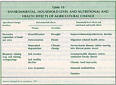 3.11 In the second instance, agricultural growth without technical improvement is possible for a limited time only through resource mining and area expansion (where excess land and labour exist). Such growth does not raise incomes and is not sustainable. It leads typically to resource degradation. Yet food-insecure households do not deliberately degrade their resource base; on the contrary, they are usually fully aware that their food security is threatened if their environment is threatened (Davies, Leach and David, 1991). Much environmental destruction such as deforestation and soil erosion can be ascribed to the struggle of the poor to feed themselves (Vosti and Scherr, 1994). It is estimated that half of Africa�s poor farmers live in environments with a highly vulnerable natural-resource base. In Latin America, the figure is closer to 80 percent (Leonard, 1989). In marginal areas appropriate agricultural technology can go a long way towards stabilizing food availability and facilitating food access for the poor. When agriculture expands into marginal areas or when resource mining occurs, primary and secondary environmental degradation effects may result (see Table 10).