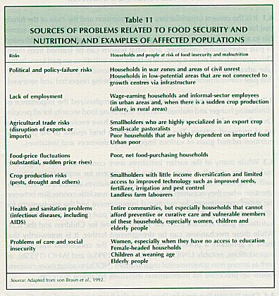 3.15 To sum up, different types of nutritional risks affect different groups of households and their members in different ways (Table 11). The most severe nutritional problems arise when vulnerable household members are hit by negative outcomes of two or more risks simultaneously. The possible combinations are numerous. In order to improve nutrition, it is necessary to identify the specific risks involved and to develop effective means of reducing them.