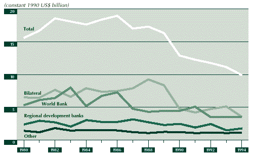 3.25 The share of agriculture in total development finance has been declining for some time. World Bank lending to agriculture, as a share of total lending, has fallen from 30 percent in the 1970s to 16 percent in the 1990s. This reflects the declining share of the agricultural sector of the bank�s developing member countries as their economies grew. However, there has also been a recent and disturbing absolute decline in external assistance to agriculture. After the food crisis in the early 1970s annual commitments rose to around US$12 billion. This was maintained through the first half of the 1980s and increased to US$15 billion towards the end of the decade. Thereafter commitments fell back to US$12 billion in 1992 and have continued to decline since, falling to around US$10 billion per year in 1994 (see Tables 5 to 10). The fall appears even more dramatic if adjusted for inflation, from US$19 billion to $10 billion (in constant 1990 US dollars), and when it is considered that sectoral statistics increasingly include support for environmental protection and natural resources management, which, essential as they are, have less direct and immediate impact on food production.