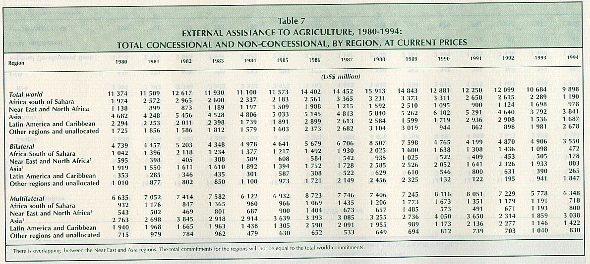 Table 7: External assistance to agriculture, 1980-1994: Total concessional and non-concessional, by region, at current prices