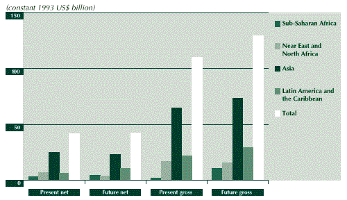 3.34 It is debatable whether the objective for agriculture to be sustainable while producing the extra food needed by a growing and, on average, wealthier world population, would also imply extra investment and recurrent costs. If so, most would be incurred at farm level in connection with modified agricultural practices and very little would be needed as formal finance (see Box 5). Partial orders of magnitude for achieving sustainability where there was none before have been estimated by the World Bank (1992) and the Asian Development Bank (AsDB) (1995). According to these estimates, environmental protection and rehabilitation of the natural resource base in AsDB�s developing member countries could cost US$13 billion (of which US$3.6 billion are agriculture related) annually under a base scenario, and US$70 billion (US$15.4 billion agriculture related) if accelerated clean-up and prevention were decided on. The World Bank has estimated the extra cost of sustainable soil management at US$10 billion to $15 billion annually worldwide, including low-cost soil stabilization works and practices of over 100 million hectares per year and watershed stabilization of over 2 to 4 million hectares per year.