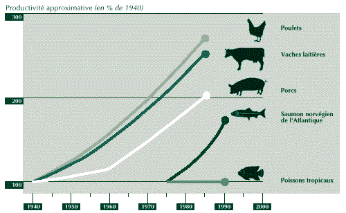 5.9 De plus, il est prouvé que, pour certains produits animaux, la science moderne est encore loin d’avoir réalisé le potentiel génétique des espèces productrices (voir la figure, qui illustre de façon schématique 50 ans d’évolution de la productivité à partir de 1940, pour les volailles, les vaches laitières, les porcs et le saumon d’élevage de l’Atlantique). En aquaculture tropicale, grâce aux améliorations génétiques réalisées au cours des 10 dernières années, la productivité à la ferme de différentes espèces de carpes et des tilapias a augmenté de 30 à 50 pour cent en 5 ans, ce qui laisse présager pour le futur une plus grande disponibilité de protéines et des prix en baisse. Au stade actuel des travaux de recherche sur les espèces de poissons et certains types d’animaux d’élevage, la productivité reste basse et de gros gains de productivité sont possibles. La sélection et l’utilisation des ressources génétiques animales en vue d’accroître la productivité et la résistance aux maladies, revêtent une importance croissante pendant la révolution verte. Il est important également de considérer ces progrès dans le contexte des systèmes de production étant donné que les exploitants pratiquent souvent une agriculture mixte dans le cadre de leur stratégie de sécurité alimentaire. Les questions de nutrition et de santé doivent également être traitées.