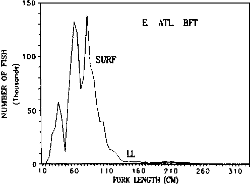 On the other hand, fishing by various surface gears for the same age groups also occurs almost in the same area and at the same time (e.g., troll and baitboat for age 2-4). The situation is further complicated by many of these gears catching tunas other than bluefin (e.g., Spanish trollers catch albacore as the target species; Asian longliners also target bigeye and most of the other tunas and Spanish longliners target swordfish).