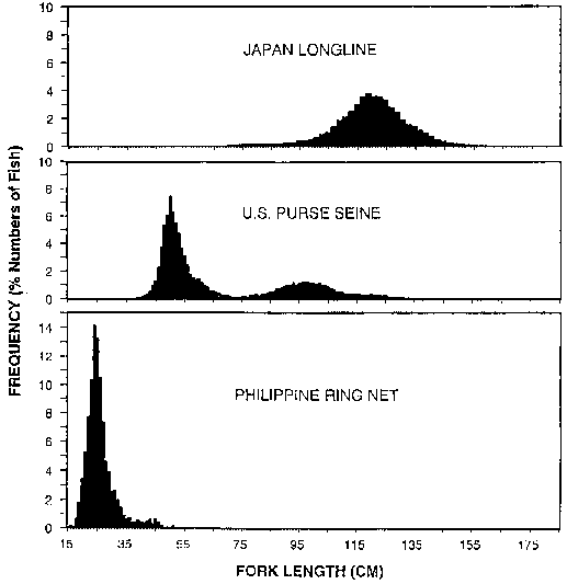 This suspicion is reinforced by data on sizes of yellowfin tuna in the catches. Although different sizes of fish are caught by the different gears, the range of sizes taken by purse seine gear overlaps sizes taken by other gears (Figure 2). The USA purse seiners, for example, typically catch yellowfin tuna from approximately 35 cm fork length (FL) to 150 cm FL. Japanese longliners catch primarily large yellowfin tuna at sizes that overlap those of the purse seiners in the range of 60 cm FL to 150 cm FL. Within this overlapping size range, the purse seiners catch 5 to 8 times as many yellowfin tuna as longliners. Philippine ring net gear, on the other hand, catches primarily small yellowfin tuna in the range of 15 cm FL to 50 cm FL. Fish caught by this gear overlap somewhat sizes taken by purse seiners, but not sizes taken by longliners.