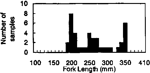 The sampling scheme was to collect yellowfin and bigeye tunas of 150-350 mm FL, randomly selecting five fish in every 50 mm length interval, at each sampling site and time. Accordingly, the total number of fish sampled would be 320 fishes for each sampling. In this way, it was expected that there would be enough fish to estimate the ratio of species misidentifications by samplers, if it existed. In addition, the sample should be large enough to characterise any changes in morphological characters by size and by season.