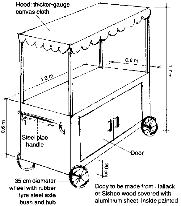 Some possible measures such as improvement of kiosks (Figure 2), pavements and access to potable water were field tested. Training programmes and materials were developed based on the study results and field tested. Training for inspectors and vendors was delivered by AIIHPH. The programmes were innovative in their means of presentation and included open-air lectures, exhibitions, posters, street plays, video presentations and discussions. In addition, the training of Calcutta police personnel involved in street food inspection and control was organized to increase their awareness of their role in this sector. The Calcutta Police Commissioner proposed action programmes in this matter as well. AIIHPH also tested a consumer education campaign on street foods within the project areas.