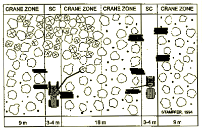 Power saw and forwarder: Applicable for clearing of natural regenerations, single-stem cutting and thinning. Trees are felled perpendicular to the skidding corridor and crosscut within the reach of the hydraulic loading crane of the forwarder. More distant trees (up to 2/3 of a tree-length) are felled towards the corridor, delimbed, pulled to the forwarder by crane, where they are crosscut and loaded. With a crane-reach of 11 m, the forwarder can pick up individual trees from natural regeneration and cause very little damage to the surrounding stand. Removal of the stems remaining from the old generation is followed by stem rate reduction, for which damaged trees are picked out first (output 8 to 25 m3 in bark/hour, on an average 12 m3 in bark/hour). (Figure 4)