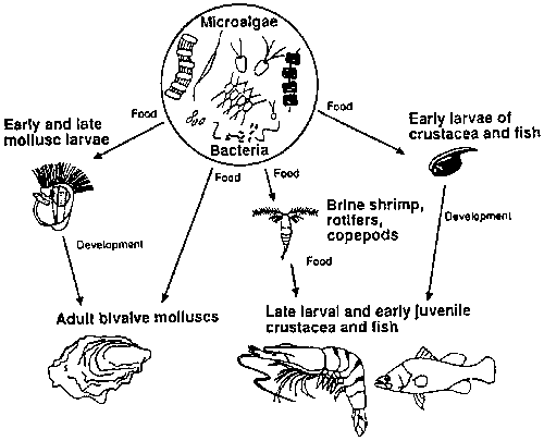 Phytoplankton comprises the base of the food chain in the marine environment. Therefore, micro-algae are indispensable in the commercial rearing of various species of marine animals as a food source for all growth stages of bivalve molluscs, larval stages of some crustacean species, and very early growth stages of some fish species. Algae are furthermore used to produce mass quantities of zooplankton (rotifers, copepods, brine shrimp) which serve in turn as food for larval and early-juvenile stages of crustaceans and fish (Fig. 2.1.). Besides, for rearing marine fish larvae according to the green water technique algae are used directly in the larval tanks, where they are believed to play a role in stabilizing the water quality, nutrition of the larvae, and microbial control.