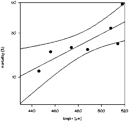 Figure 4.3.5. Correlation of mortality rate of Menidia menidia larvae and nauplii length of Artemia from seven geographical sources offered as food to fish larvae (modified from Beck and Bengtson, 1982).