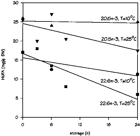The necessity of incorporating DHA in the larval diet of Japanese flounder has also been proven (Table 4.3.10.): the use of DHA resulting in a much higher survival and growth rate than in the control treatment and also facilitating enhanced resistance to stress conditions (day 50). Identical experiments have also been conducted with red seabream and have been even more conclusive: the growth of DHA-fed larvae being 50% better than the control group by day 38.